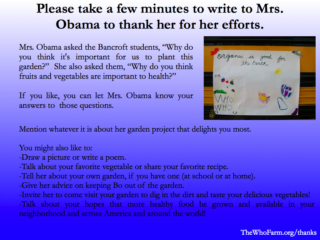 Mission: To facilitate a massive “Thank You Michelle Obama for Planting the White House Kitchen Garden campaign.” We need letters from young people (and people young-at-heart) who appreciate the First Lady’s commitment to healthy food and healthy citizens!